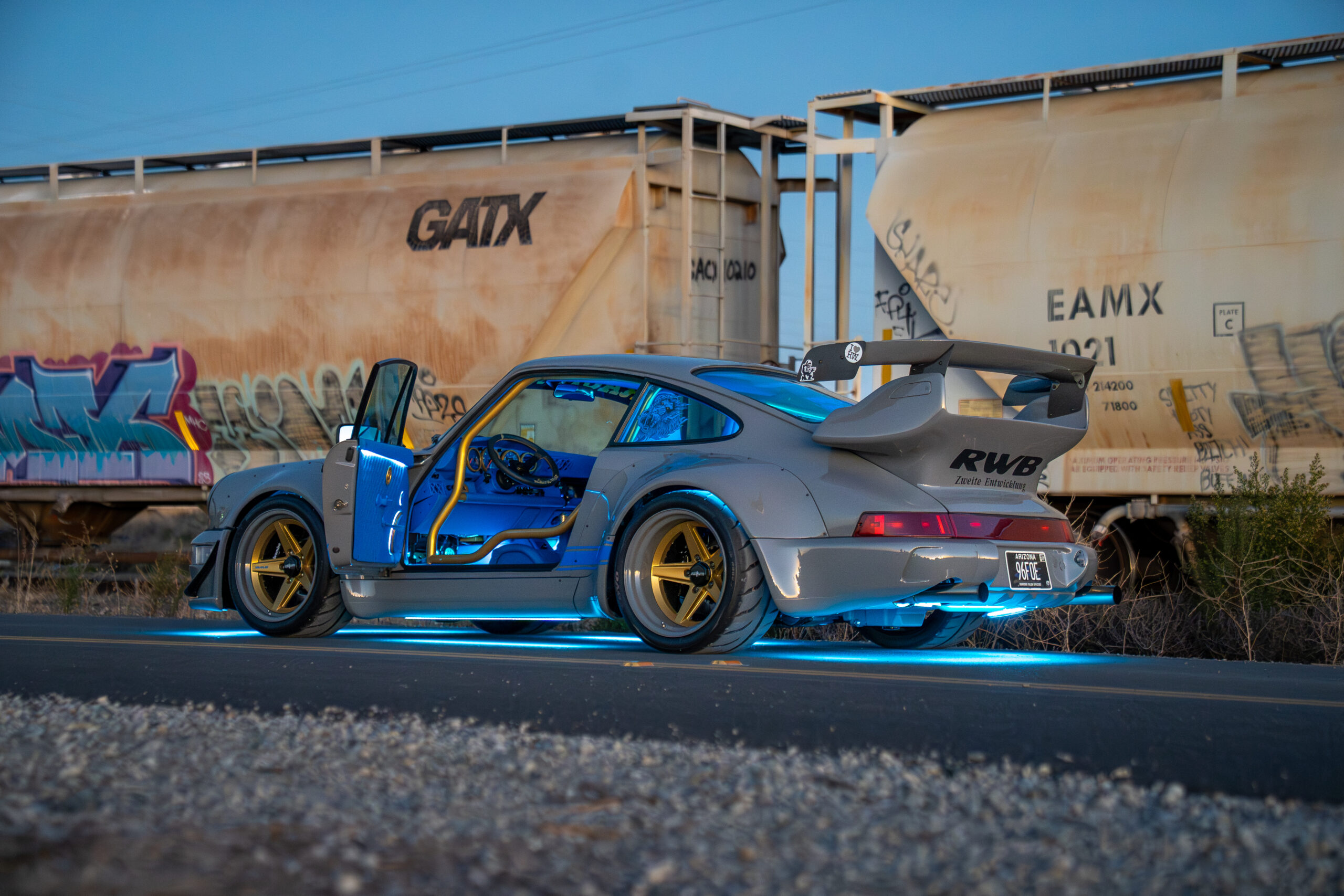 The interior is a full Provost Customs custom interior, designed and fabricated in-house, complete with custom LED lighting that illuminates the cabin and exterior accents. Built with countless one-off components and custom fabrication, this Porsche 964 RWB represents the ultimate fusion of air-cooled Porsche heritage, American V8 power, and modern performance technology.